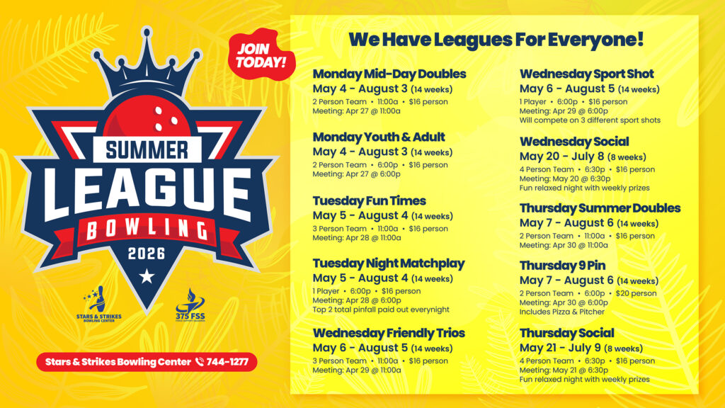 Kids ages 17 and under can Bowl Free, March 30-August 31, 2026, at the Stars & Strikes Bowling Center! To get started, sign up @ KidsBowlFree.com: Stars & Strikes Bowling Center and start receiving your coupons!