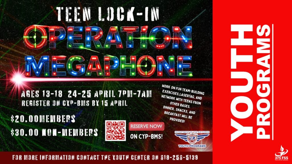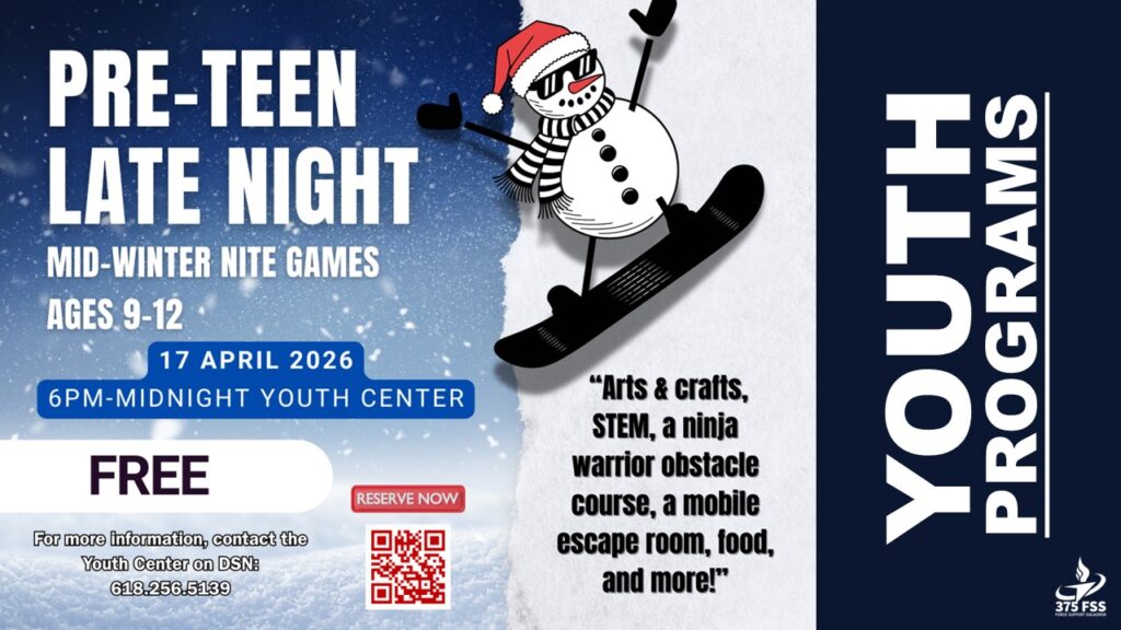 Join us for a high-energy Pre-Teen Night at the Youth Center filled with music, dancing, games, and fun with friends on May 15, 6-9 p.m. Youth, ages 9-12, will enjoy an exciting evening in a safe and welcoming environment, with food and beverages provided. Event is free for Members and $5 for Non-members. Reservations are required. Sign up through CYP-BMS or contact the Youth Center at 618-256-5139 for more information.