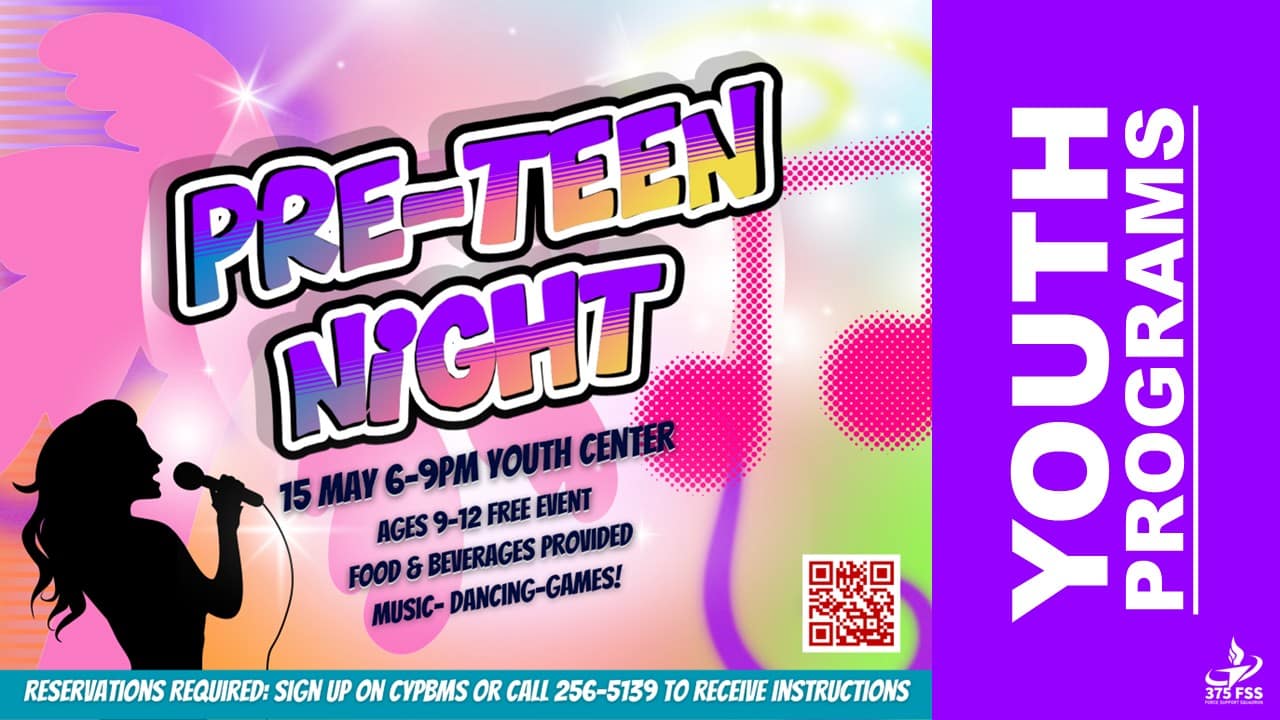 Join us for a high-energy Pre-Teen Night at the Youth Center filled with music, dancing, games, and fun with friends on May 15, 6-9 p.m. Youth, ages 9-12, will enjoy an exciting evening in a safe and welcoming environment, with food and beverages provided. Event is free for Members and $5 for Non-members. Reservations are required. Sign up through CYP-BMS or contact the Youth Center at 618-256-5139 for more information.