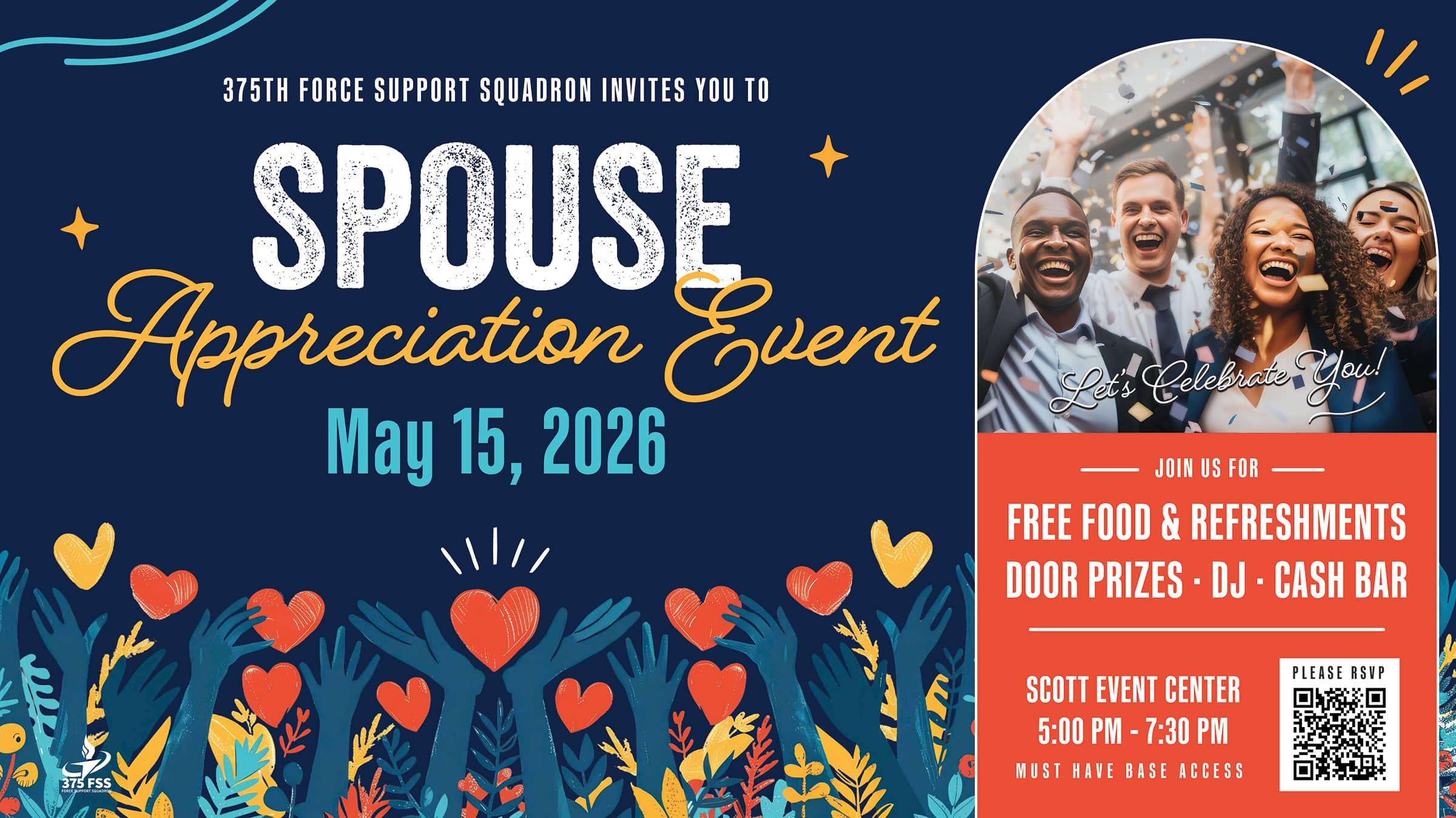 Join us for a night of celebration at our Spouse Appreciation Event on Friday, May 15 at the Scott Event Center from 5:00-7:30 pm! Enjoy free food & refreshments, try your luck with door prizes, dance the night away with a live DJ, and unwind at the cash bar. Itโs our way of saying thank you for everything you do!